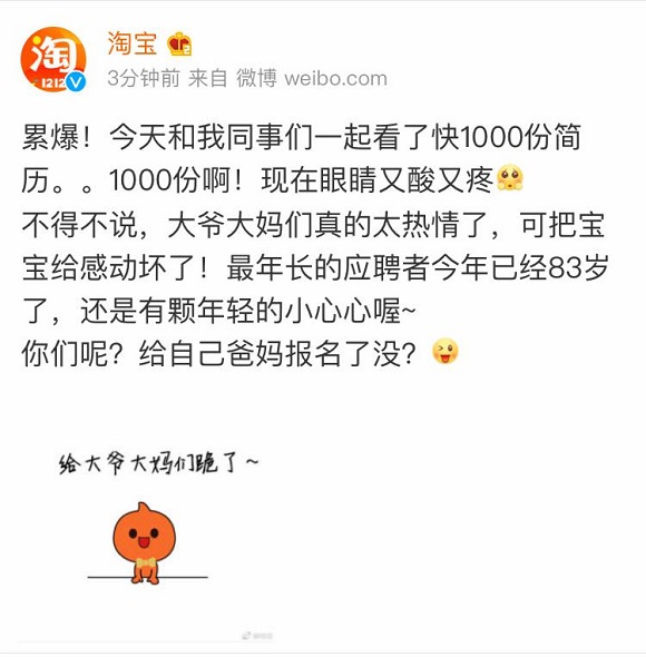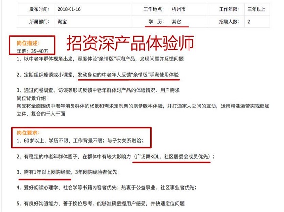 1月16日刷爆新闻头条的淘宝招聘信息还历历在目,招聘岗位为“资深产品体验师”,年薪35~40万,无学历无经验限制,要求年龄60岁以上,并且也沉迷淘宝网购至少一年,最好还叱咤广场舞天坛一隅,是广场舞KOL(意见领袖)、社区居委会成员优先。